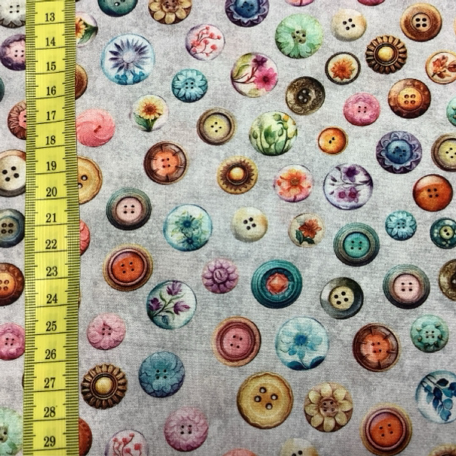 10 cm Patchworkstoff „Knopf an Knopf“. Viele bunte Knöpfe mit grauem Hintergrund