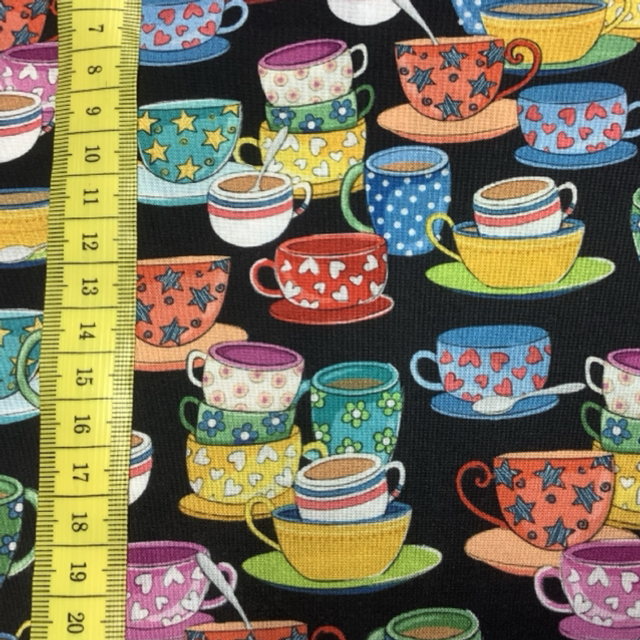 10 cm Patchworkstoff „Tea Time“, bunte Tee und Kaffeetassen zieren diesen Stoff