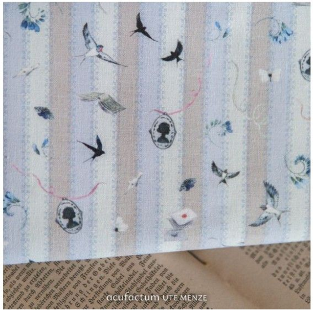 Die von Sophia Drescher gestalteten Illustrationen vereinen auf bezaubernde Weise Klarheit und Verspieltheit: Horizontale Streifen in harmonischen Blautönen bilden den ruhigen Hintergrund, während darauf eine Welt voller zarter Details zum Leben erwacht. Fliegende Schwalben, flatternde Bänder und filigrane Blüten schaffen eine lebendige, romantische Szenerie. Daneben laden liebevoll arrangierte Kameen die edlen Schmuckstücke vergangener Zeiten und Bücher zum Träumen und Verweilen ein. Dieser Kontrast zwischen klaren Streifen und den verspielten Motiven verleiht dem Stoff eine besondere Eleganz, die sich wunderbar vielseitig einsetzen lässt.