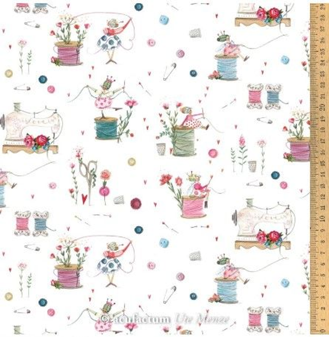 Zwischen Knöpfen, Garn und Nähmaschine ist was los! Kleine Elfen zaubern wunderbares in der Nähstube und sind ganz vertieft in ihr Fadenspiel. Unser Herz hüpft höher bei diesen zauberhaften Motiven.