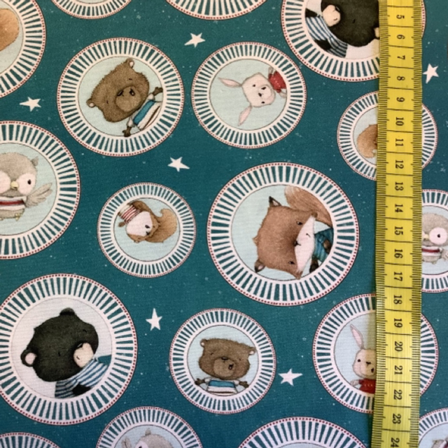 Patchworkstoff mit süßen Tierkinder auf türkisem Grund