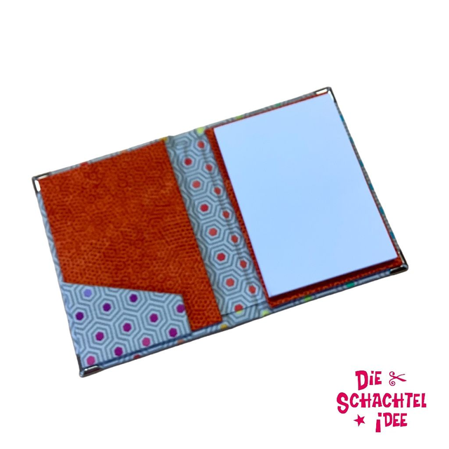 DIN-A7 Notizblock mit bunten Hexagons, innen orange