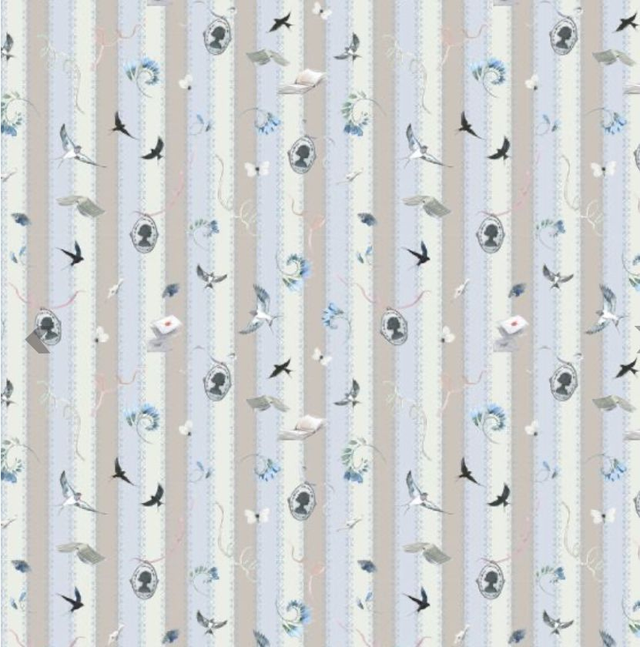 Die von Sophia Drescher gestalteten Illustrationen vereinen auf bezaubernde Weise Klarheit und Verspieltheit: Horizontale Streifen in harmonischen Blautönen bilden den ruhigen Hintergrund, während darauf eine Welt voller zarter Details zum Leben erwacht. Fliegende Schwalben, flatternde Bänder und filigrane Blüten schaffen eine lebendige, romantische Szenerie.