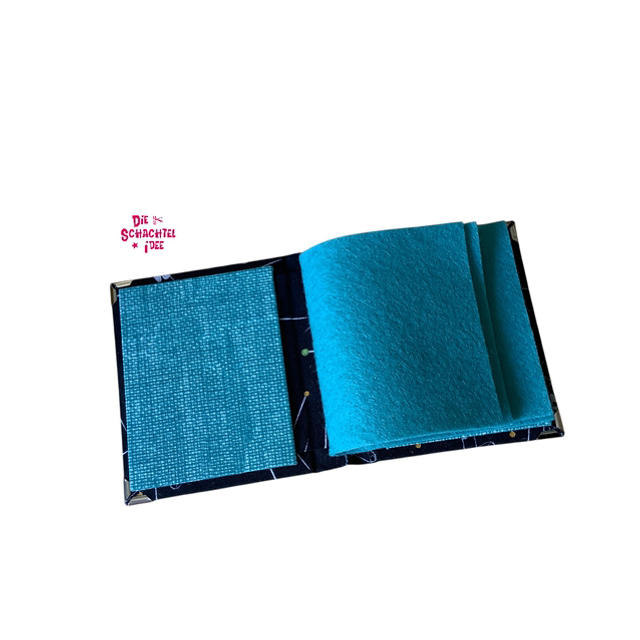 Stoff: schwarzgrundig mit Stecknadeln und Sicherheitsnadeln, Filz in türkis , Metallecken in silber