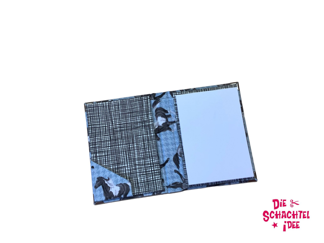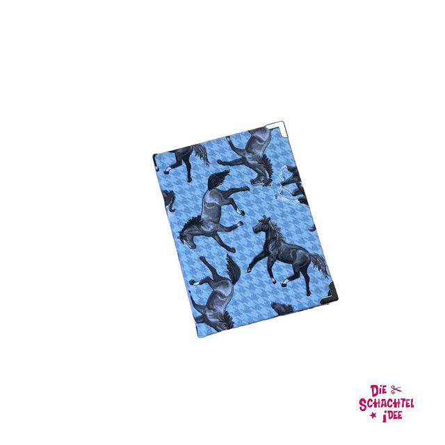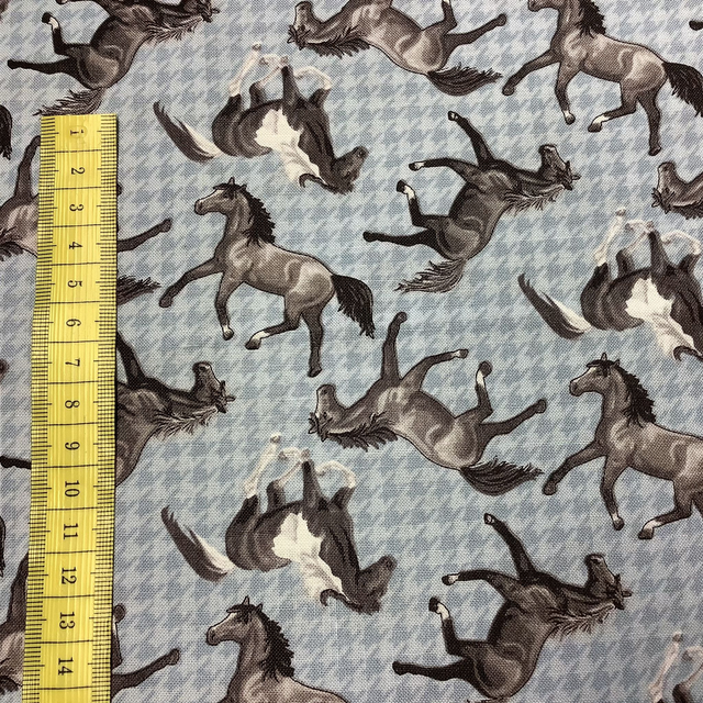 Patchworkstoff „Pferde“ mit hellblau-kariertem Hintergrund