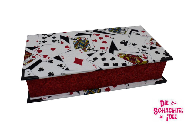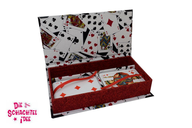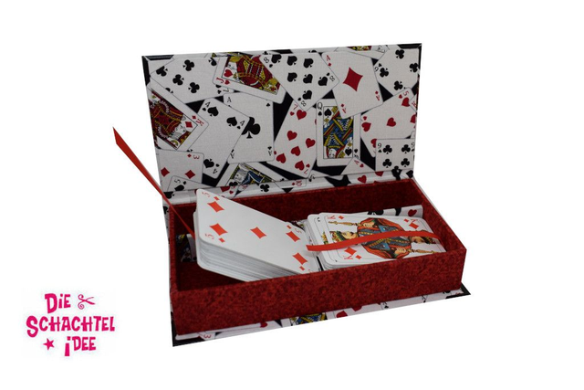 Spielkartenbox für ein Romméspiel, Stift und Würfel. An den Bändern zieht man die Karten aus der Schachtel